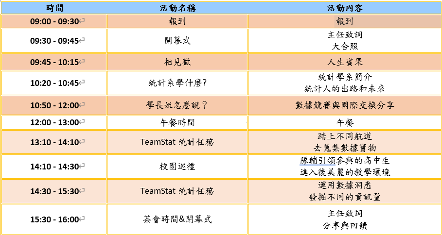 1. 了解統計學系特色 2. 親近教授交流互動 3.體驗數據分析實作