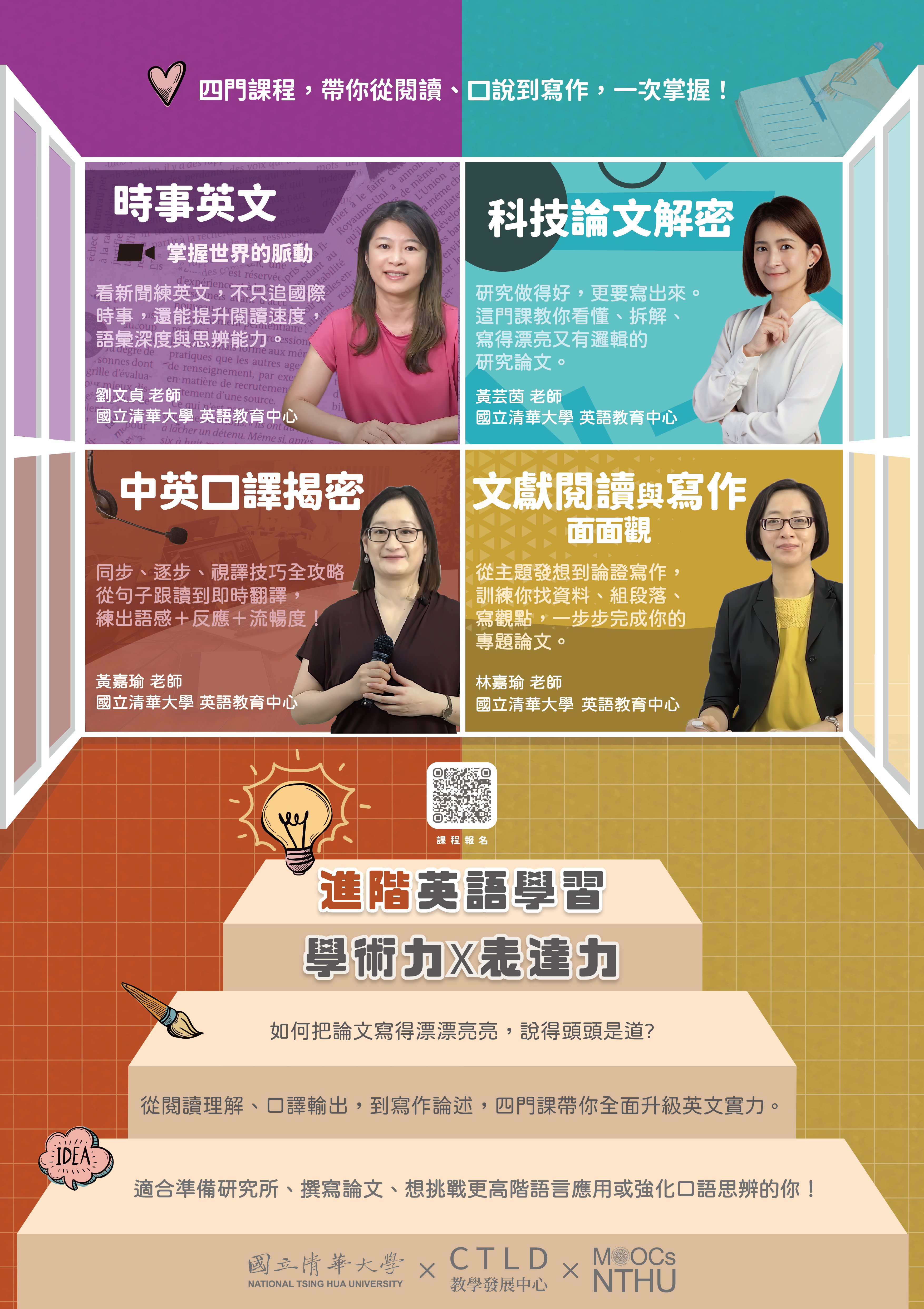 國立清華大學來函:有關「檢送本校磨課師以『進階英語學習』為主題之四門數位課程相關資料,課程即日起免費開放修習,敬請惠予協助宣傳推廣,並鼓勵所屬學生及有興趣者踴躍報名參與,請查照。」乙案,詳如附件。